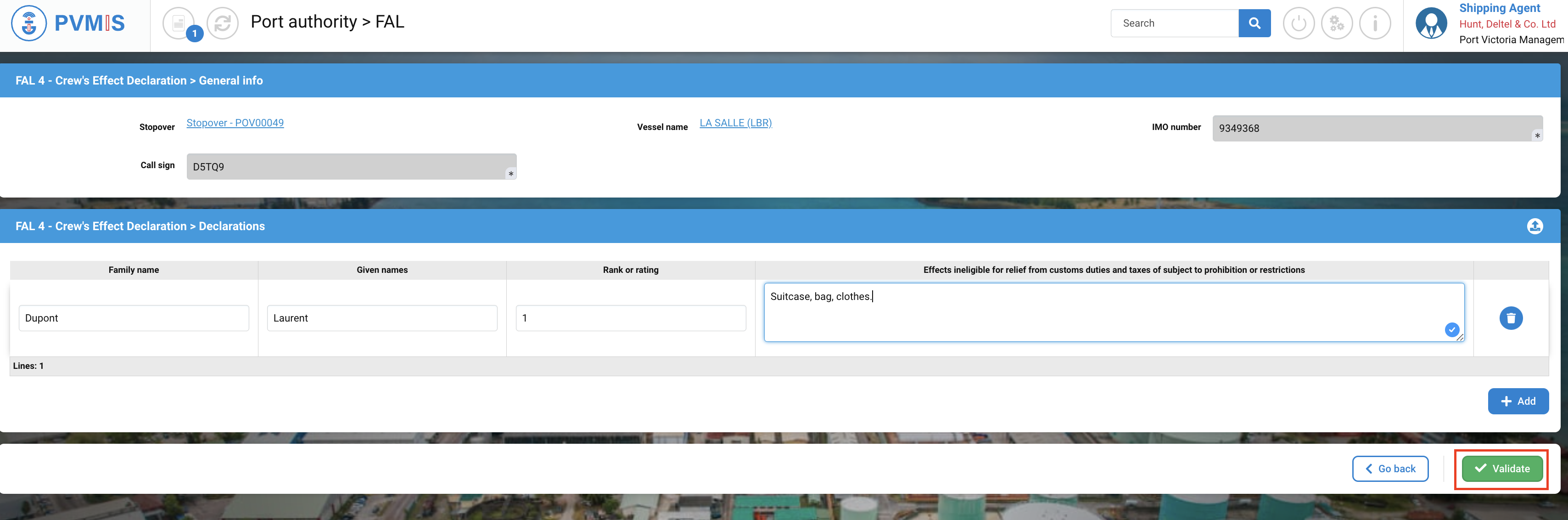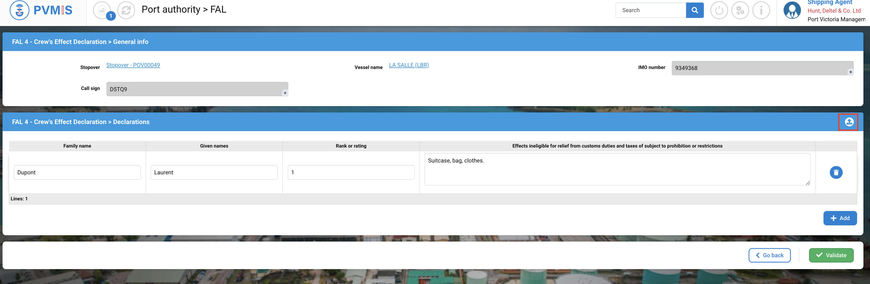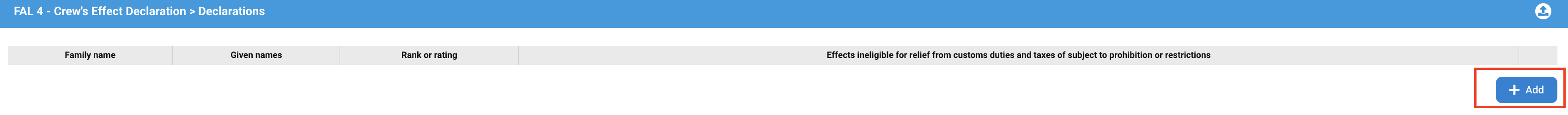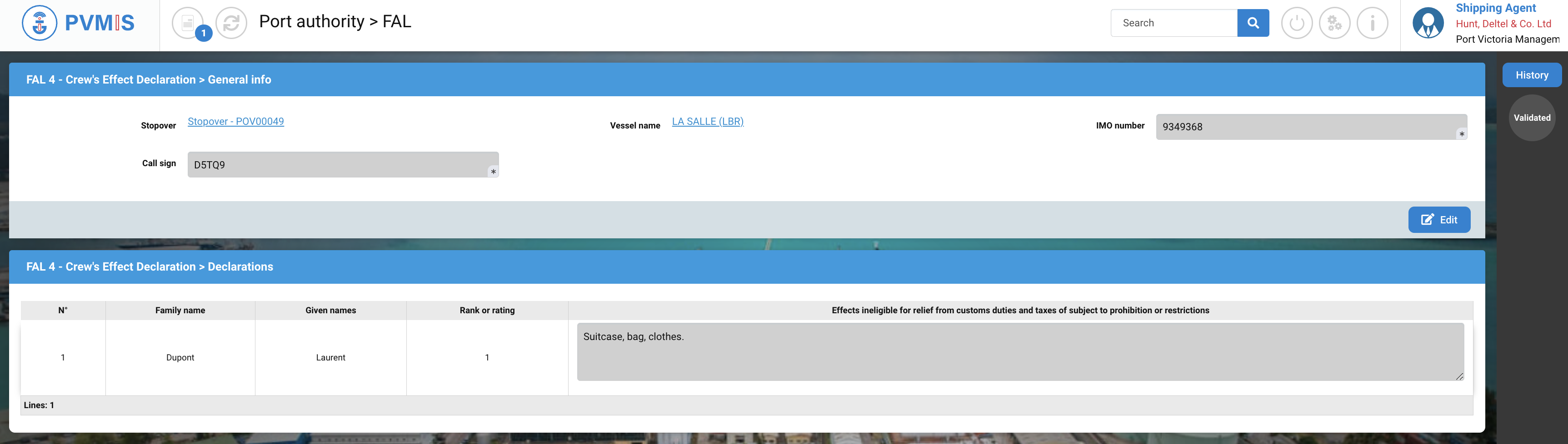 The FAL 4 is the Crew’s Effects Declaration. Most of the required information comes from the stopover data and from previous FAL forms. The ship’s store article are then added manually.