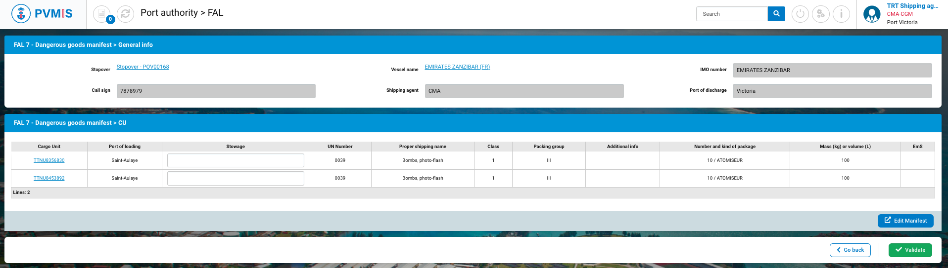 CargoUnit | CargoUnit Code. Disabled and pre-filed by the manifest information. You can click on the link to access to the detail of the CargoUnit. |