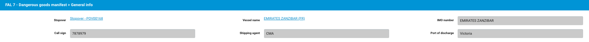 The FAL 7 is the Dangerous Goods Manifest. Most of the required information comes from the stopover data and from previous FAL forms. The manifest provides the Dangerous goods.