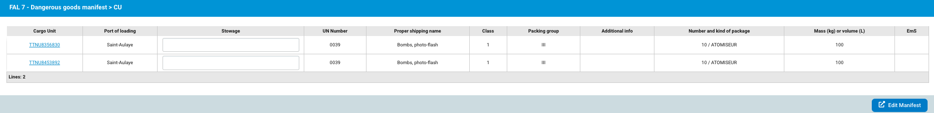 The FAL 7 data is directly provided from the information in the scheduled manifest of the manifest. If you want to edit it, you can use the Edit Manifest button to access the detail of the scheduled manifest, then go to the BLs items data to define the dangerous data of your goods line.
