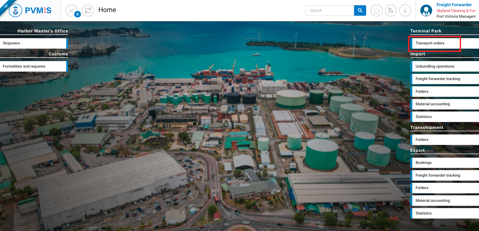 Connected as a Claimant role, from the Home page, click on “Transport orders” menu in Terminal Park section.