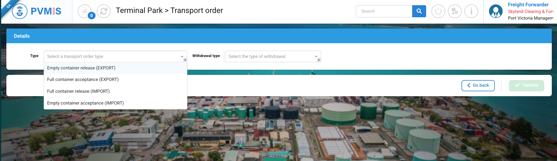 Type of transport order (Empty container release (EXPORT), Full container acceptance (EXPORT), Full container release (IMPORT), Empty container acceptance (IMPORT)).
