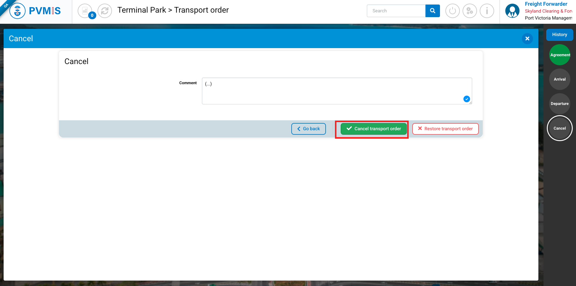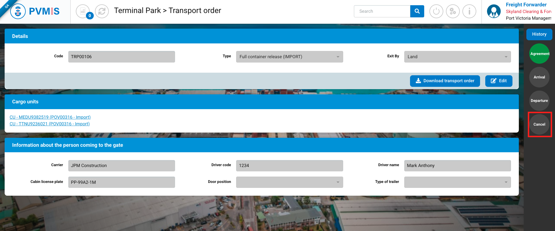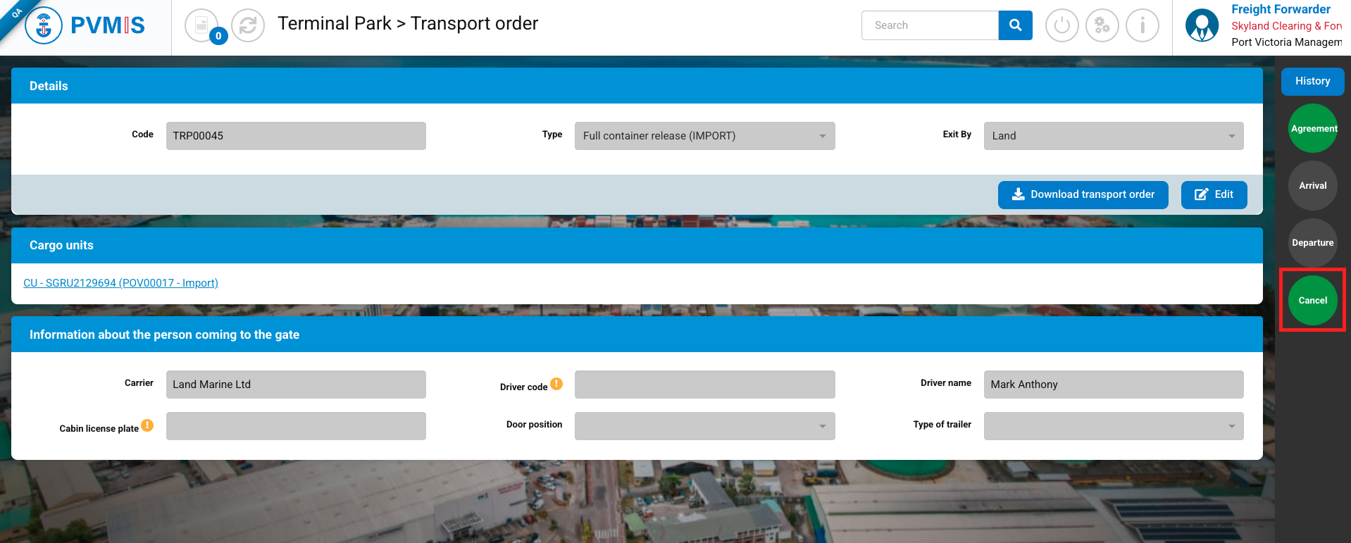 Once the transport order is cancelled, as a gate operator, it will not be possible to declare the transporter's arrival.