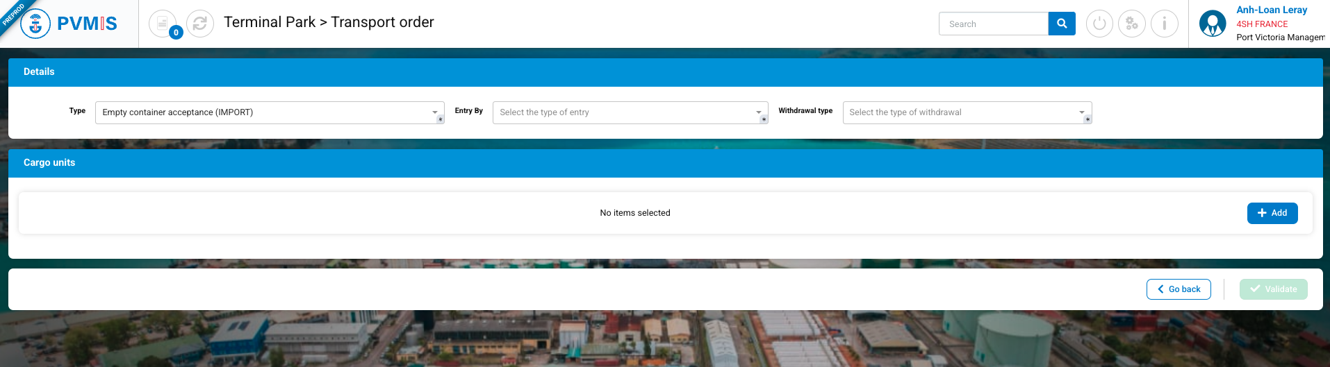 To create a Empty container acceptance (IMPORT) transport order, click on the Create transport order button and you will be redirected on the transport order creation form.