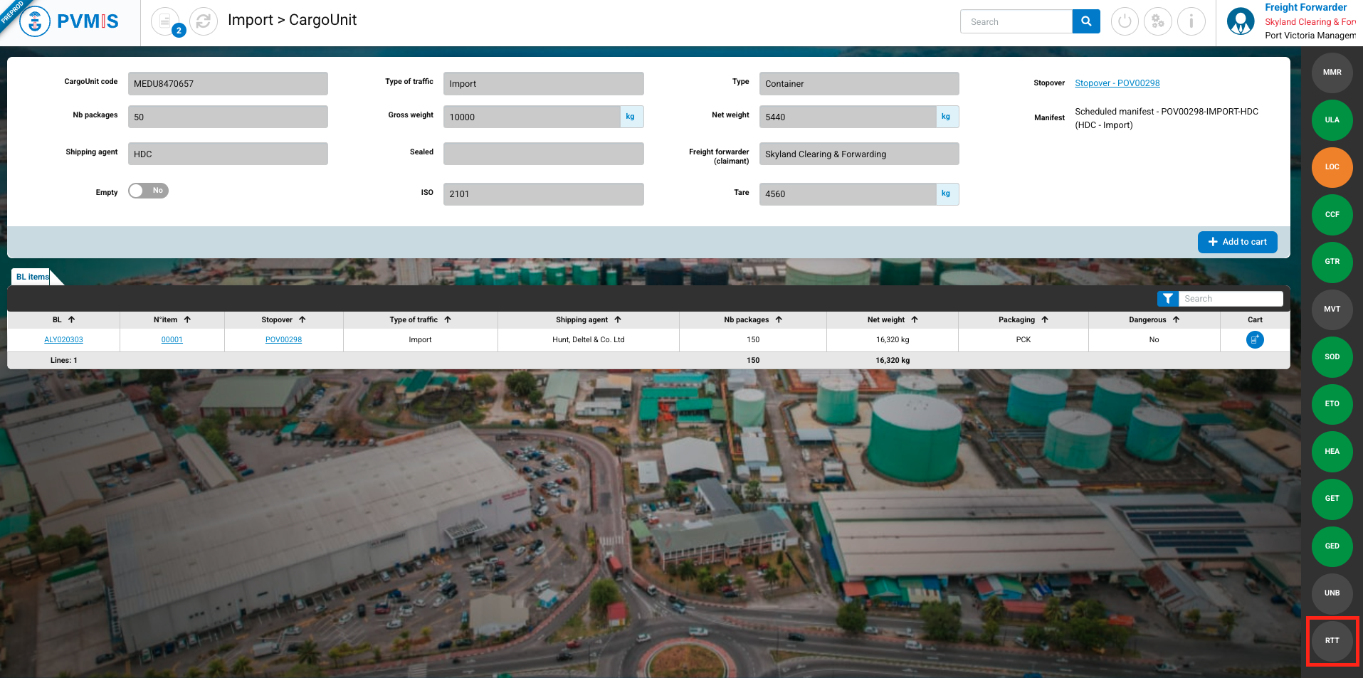 Access to create an Empty container acceptance (IMPORT) transport order from the RTT status on the detail of Cargo Unit