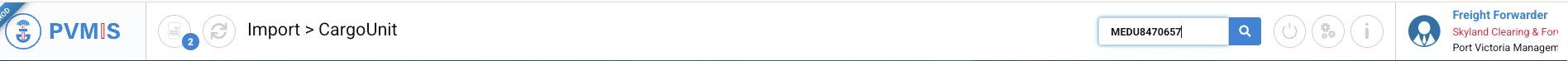 From any screen in the PVMIS application, manually enter the Cargo Unit code in the search bar at the top of your screen. Then, press the Enter key on your keyboard or click on the search icon.