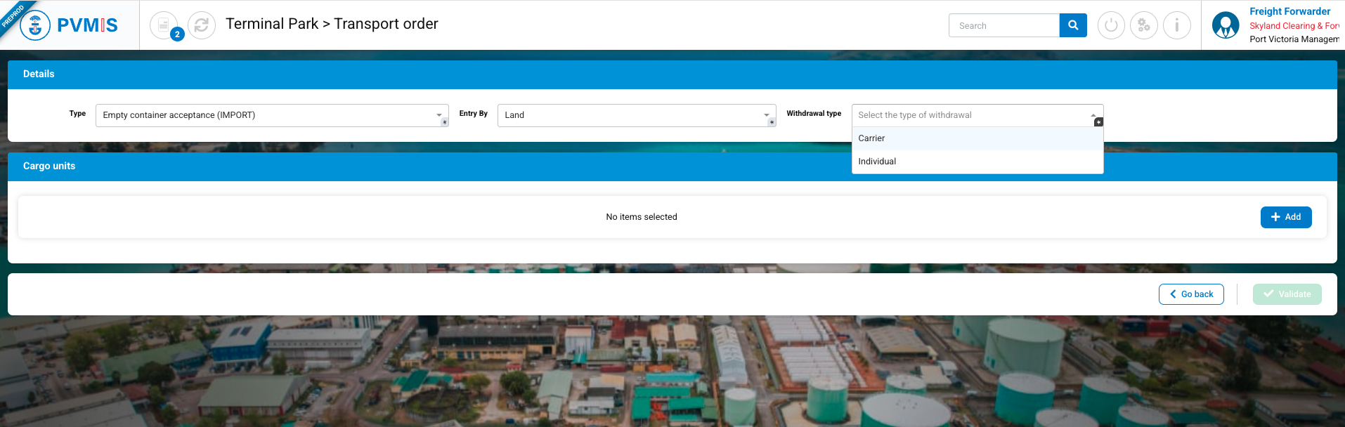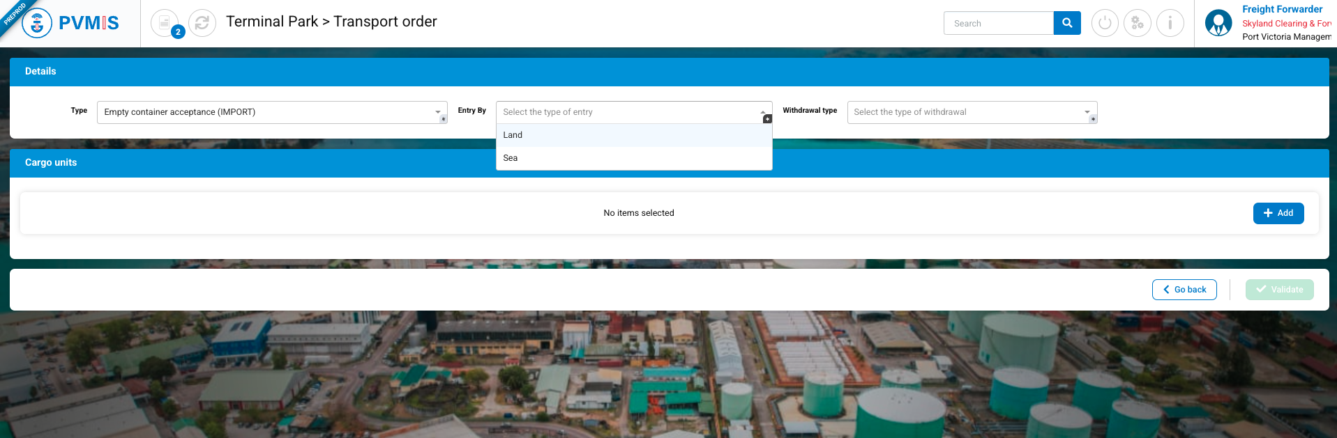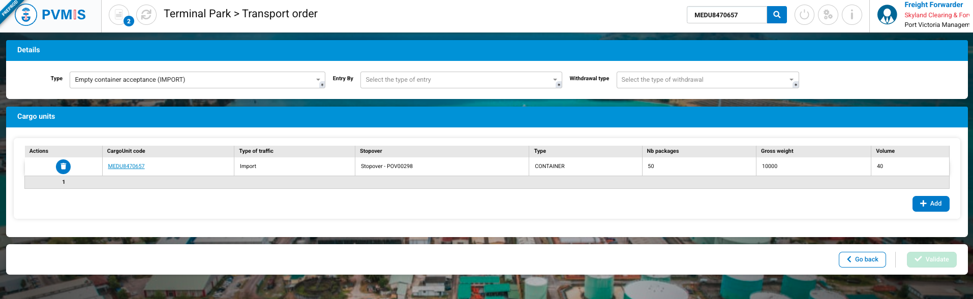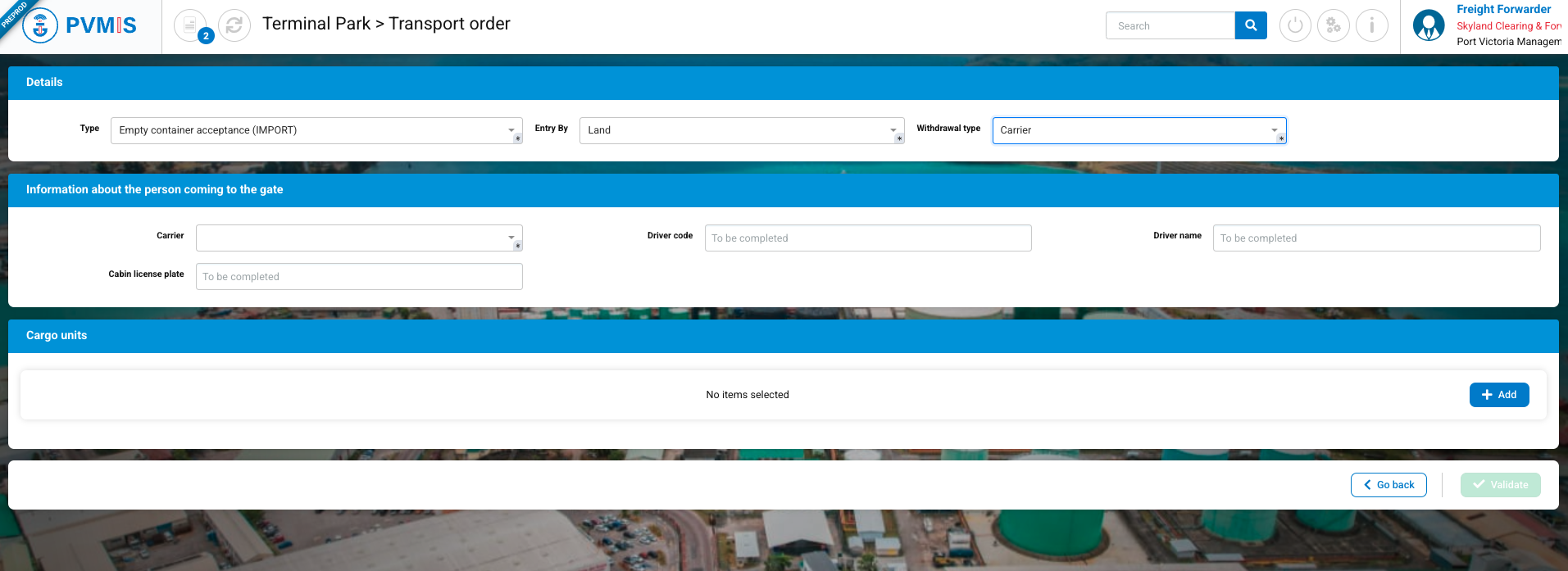 For this type of transport order, we are talking about an empty container returning to the terminal. There are two ways to create this transport order.