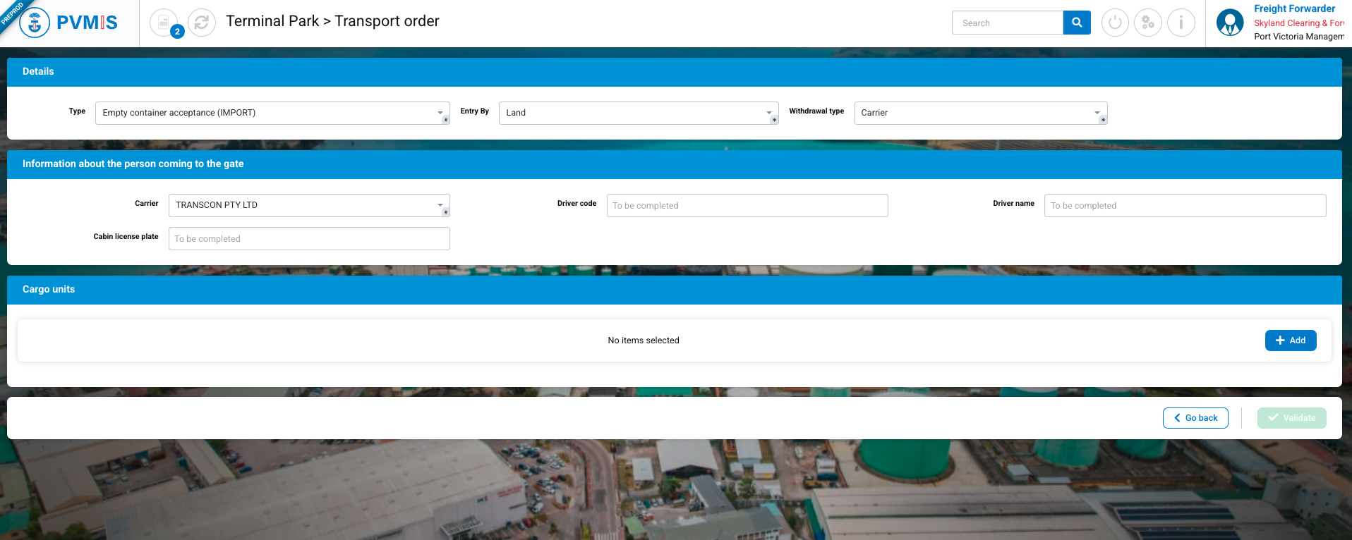 As a Claimant, to validate the transport order creation form, it is mandatory to complete all the fields in the Details section, enter a transport company in the Carrier field in the Information about the person coming to the gate section, and add at least one Cargo Unit.