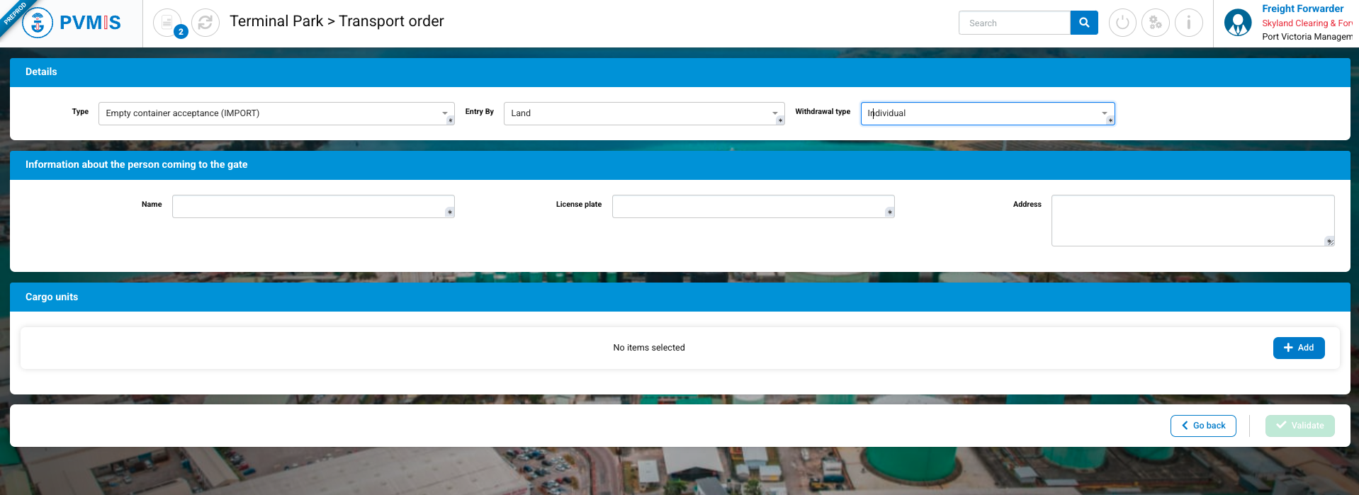 On the “Type” field, select Empty container acceptance (IMPORT) and the form will display the fields to be completed based on this type.