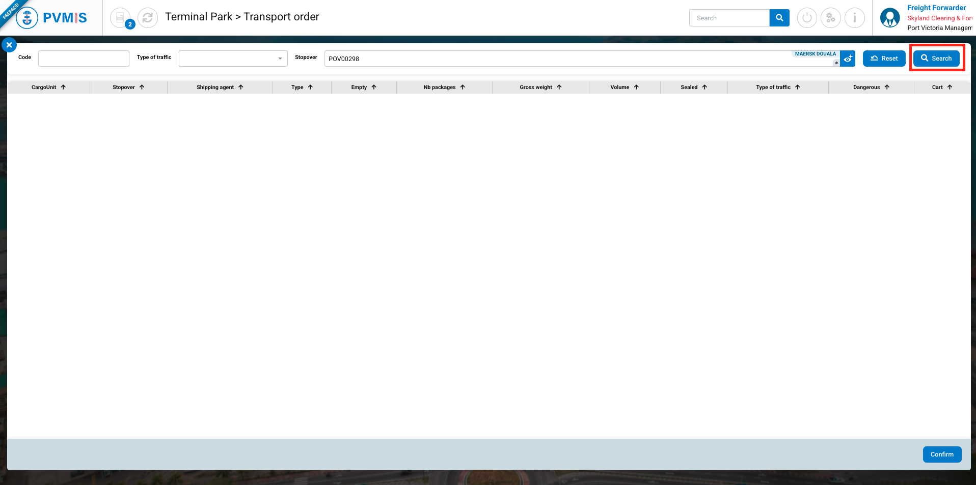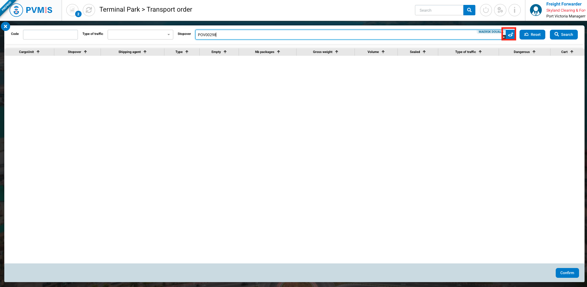 To select cargo unit, make a research relating to the stopover entering the stopover code (POVXXXXX) or click on eye icon to display the list of the stopover.