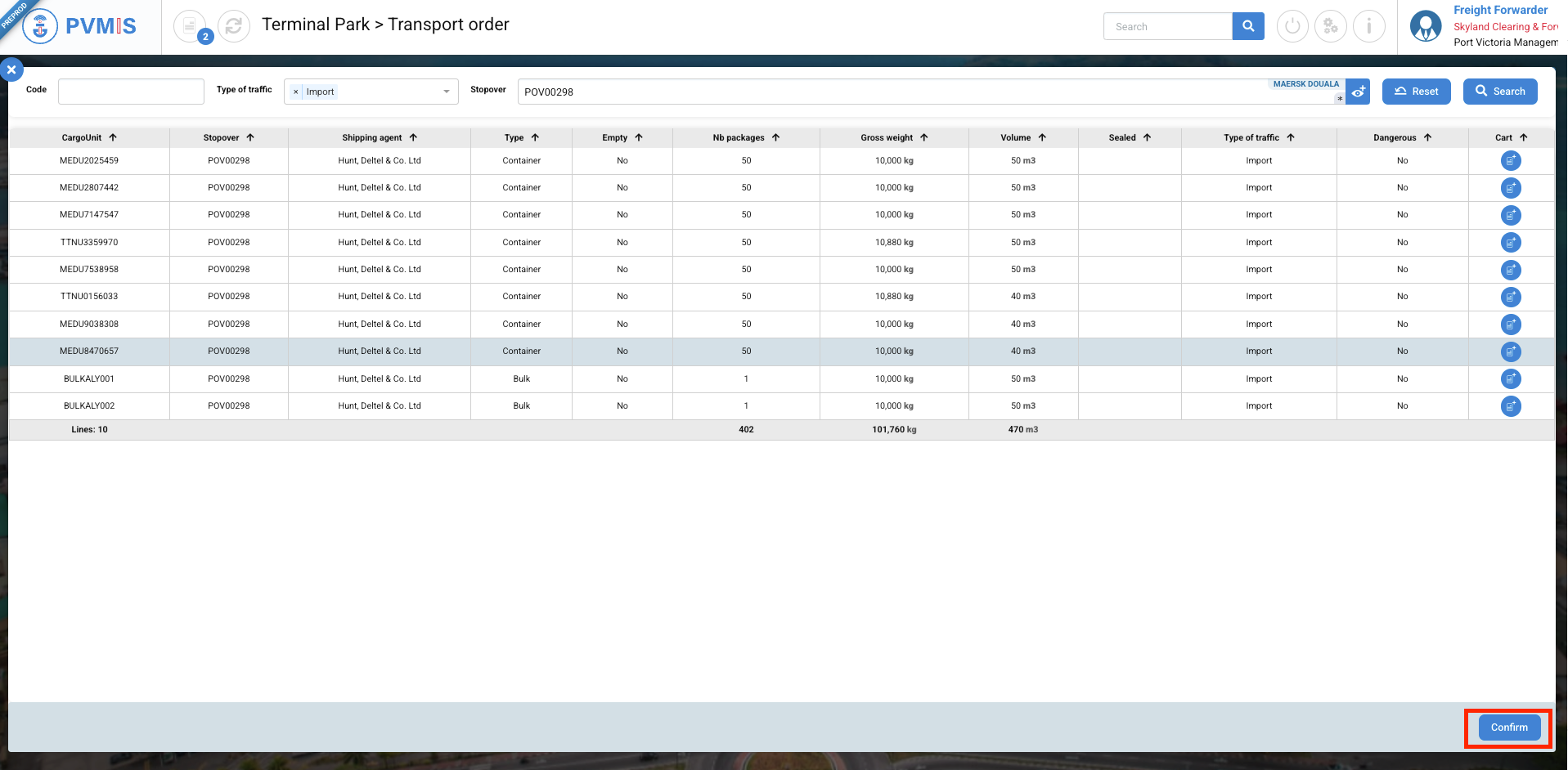 The list of Cargo Units associated with this stopover, where the claimant is named on the associated BL, will appear. To select one or more Cargo Units, click on the corresponding lines and then click the Confirm button.
