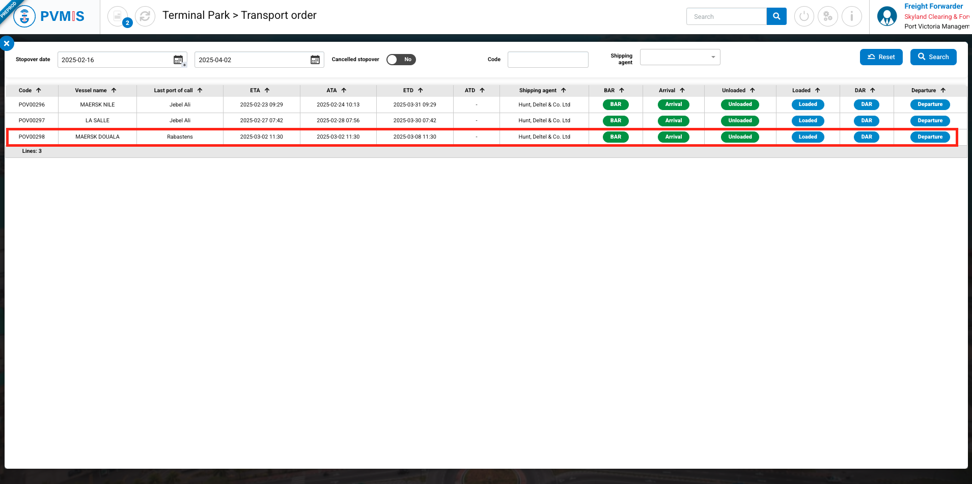 The user is redirected to the transport order list screen. The screen displays only the list of transport orders created by the freight forwarder company of the logged-in claimant.