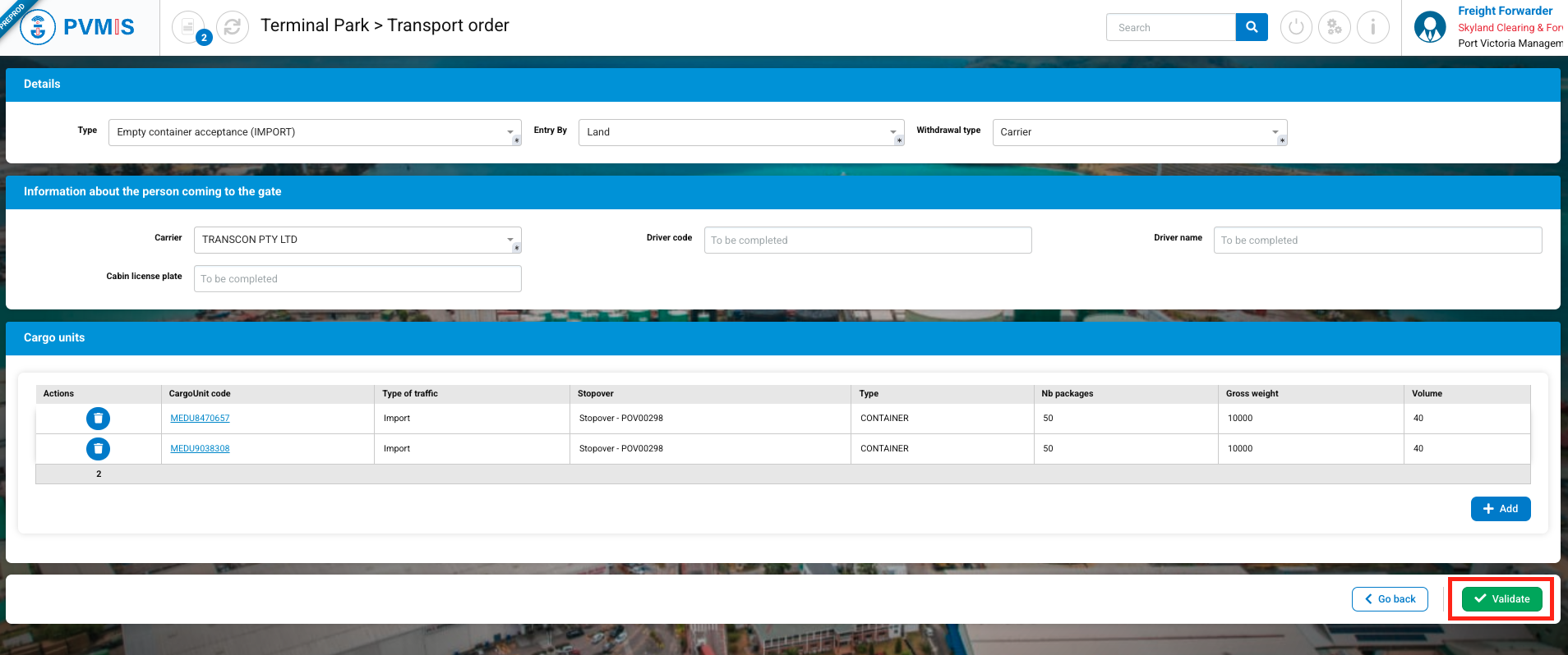 The cargo unit(s) is/are include in the transport order, now you can click on Validate button: