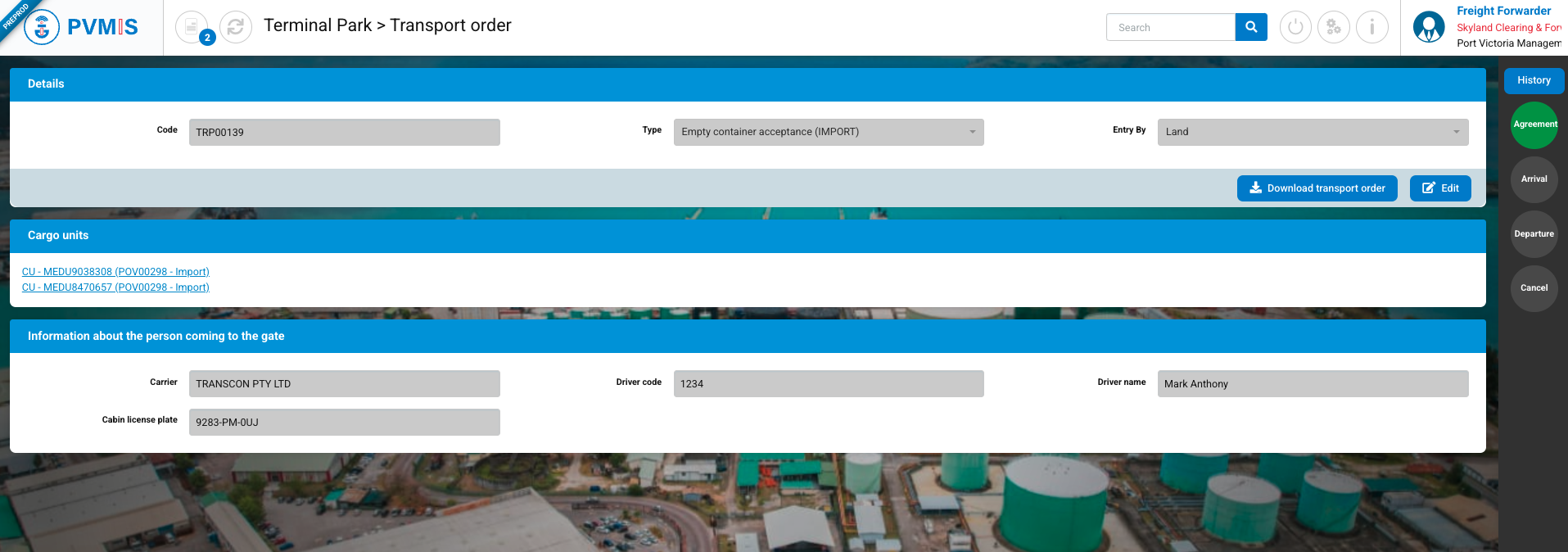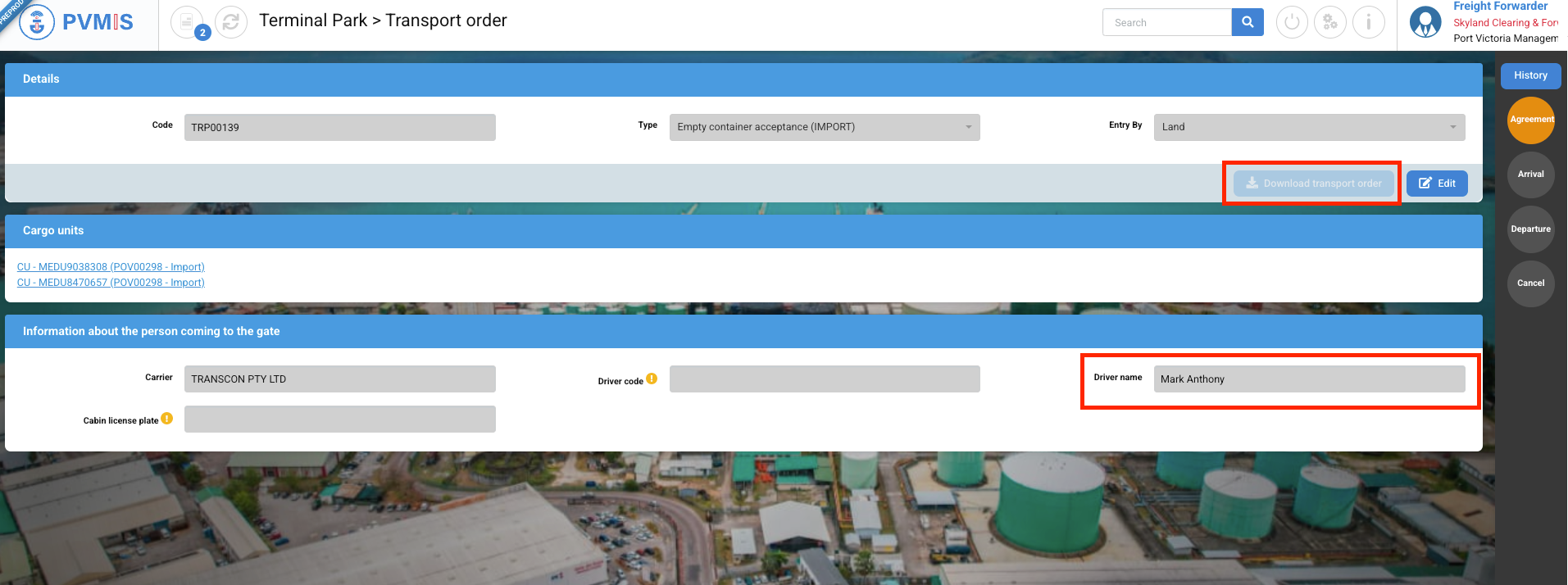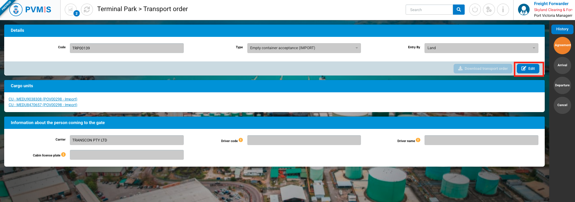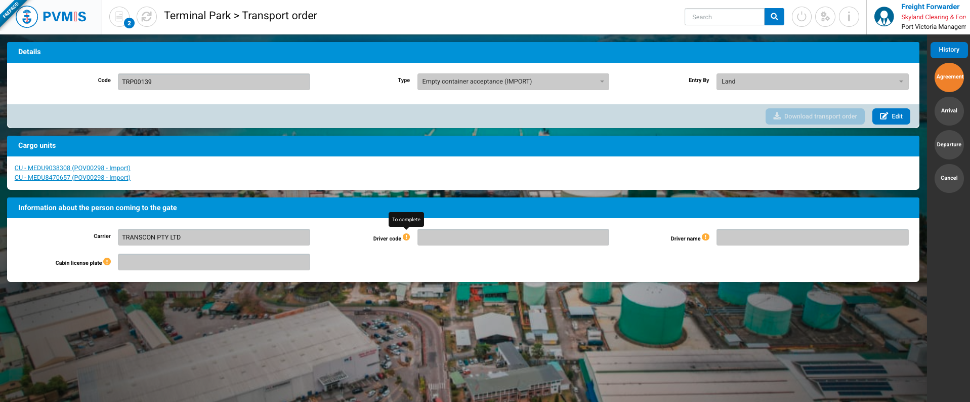 If the Driver code, Driver name, and Cabin license plate information has been completed by the claimant or the carrier, and a gate operator has declared the transporter's arrival (Arrival status in YES or PARTIAL state on the transport order), then neither role will be able to modify these details.