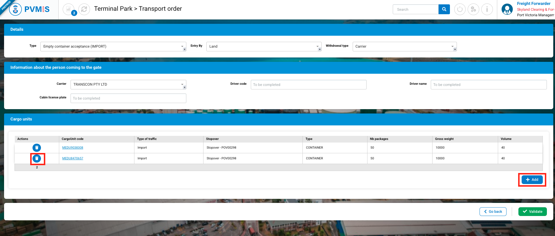 On the transport order creation form, the type of the transport order is prefiled and the cargo unit is selected (Cargo Units section), but you can add more by clicking on +Add button.