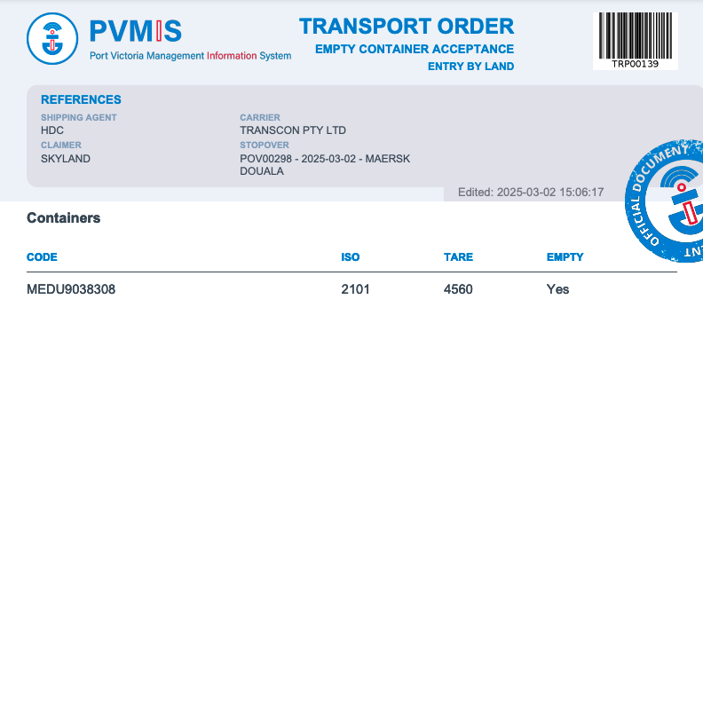 If your transport order includes multiple empty containers, there will be a page for each empty containers with the relevant information for each one.