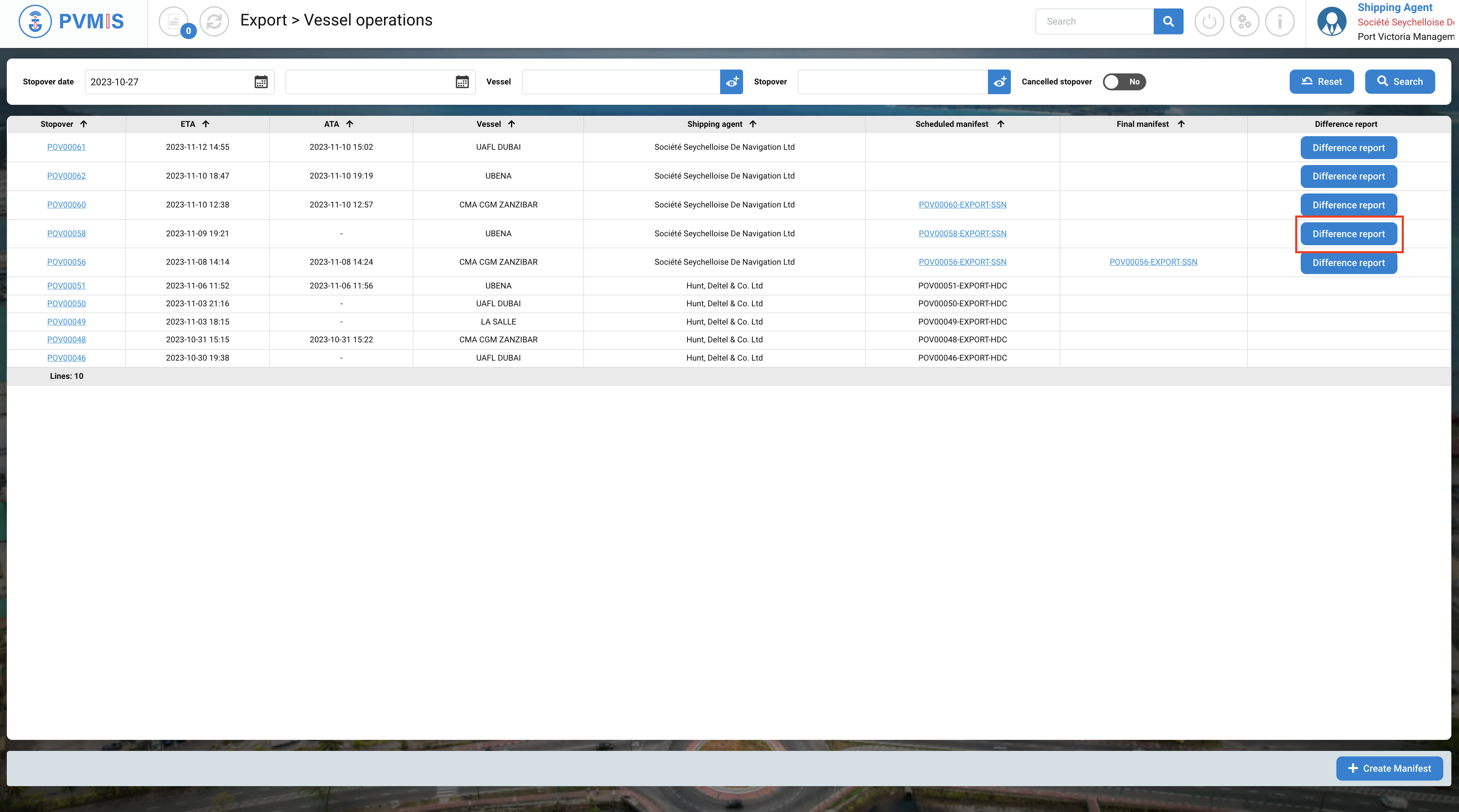 The list of the stopover is presented, click on Difference report button corresponding: