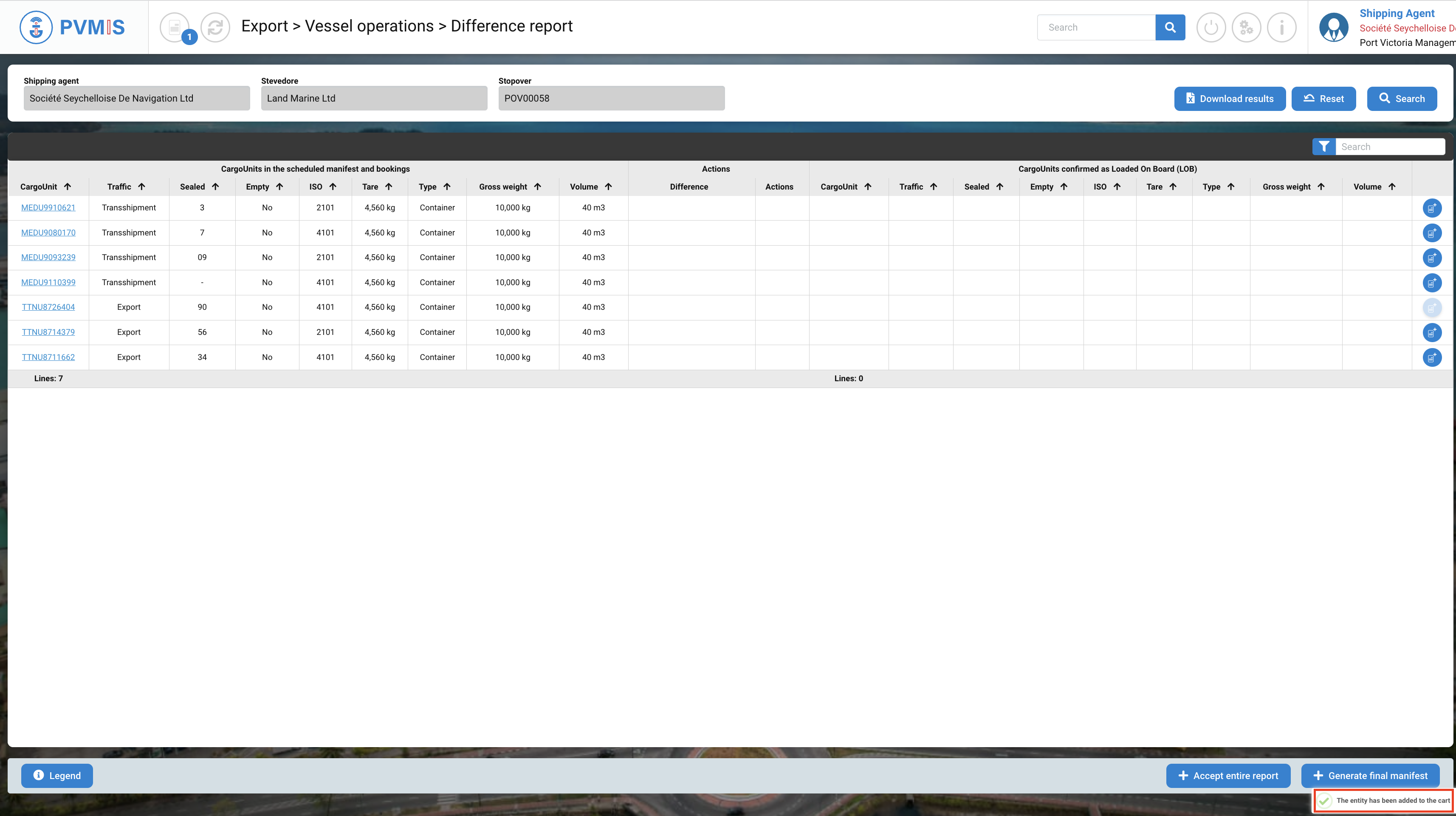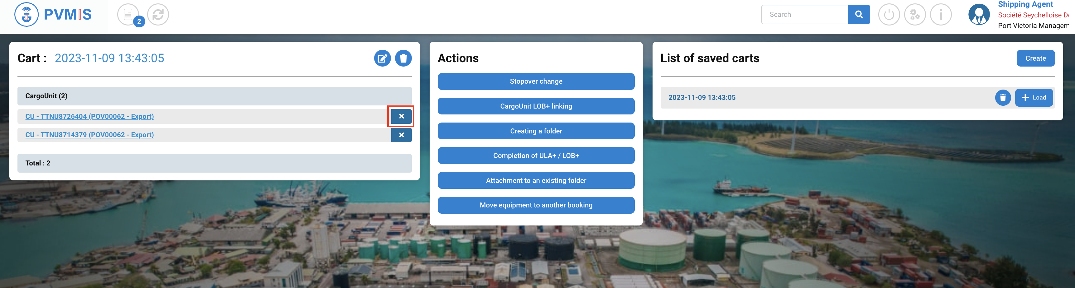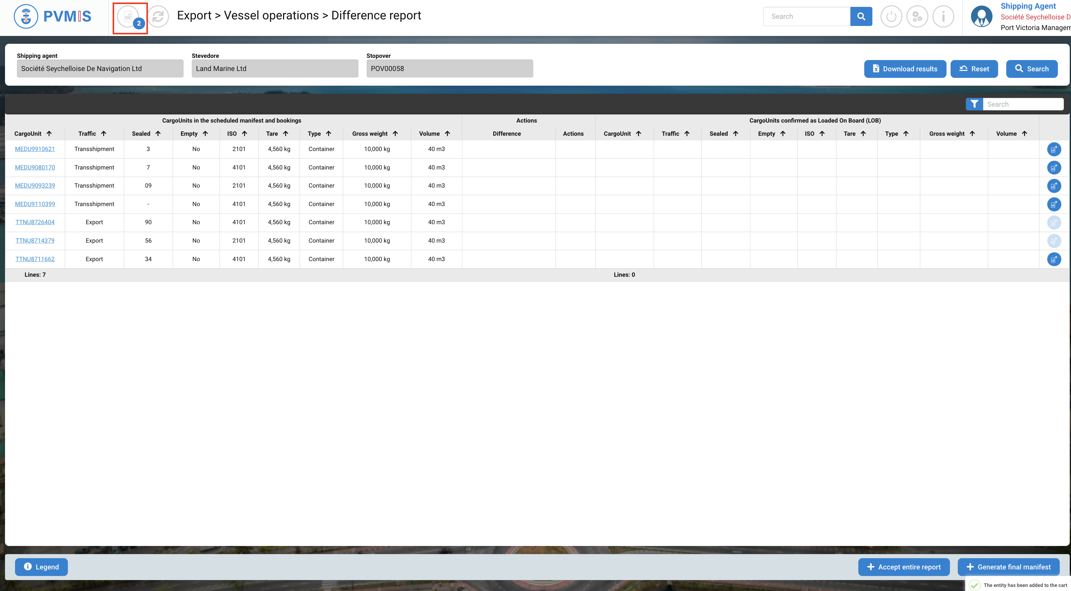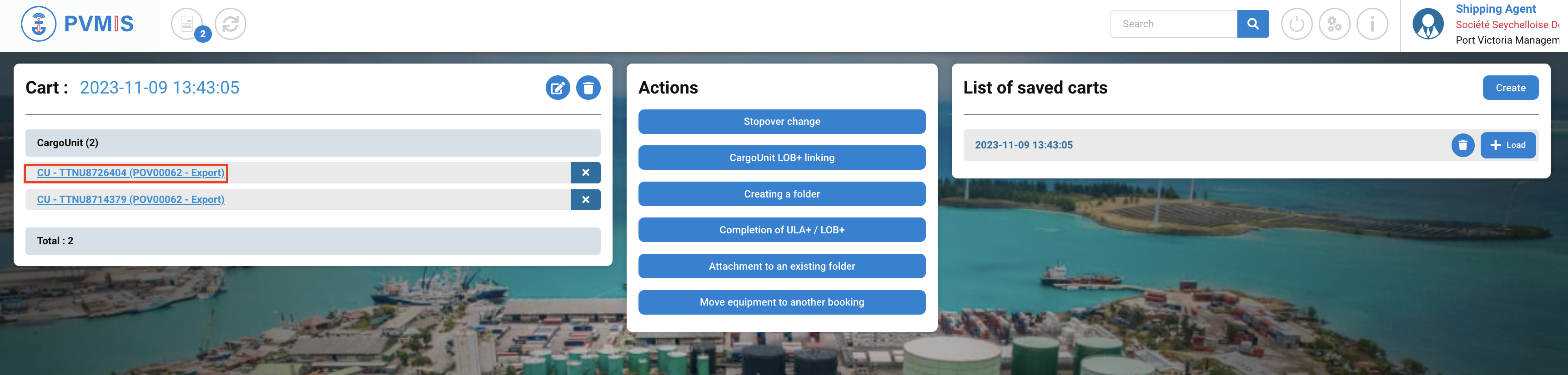 You can consult the list of the CargoUnit announced in the scheduled manifest and bookings. Select the CargoUnits which you would like to load them on another stopover by clicking on Cart icon: