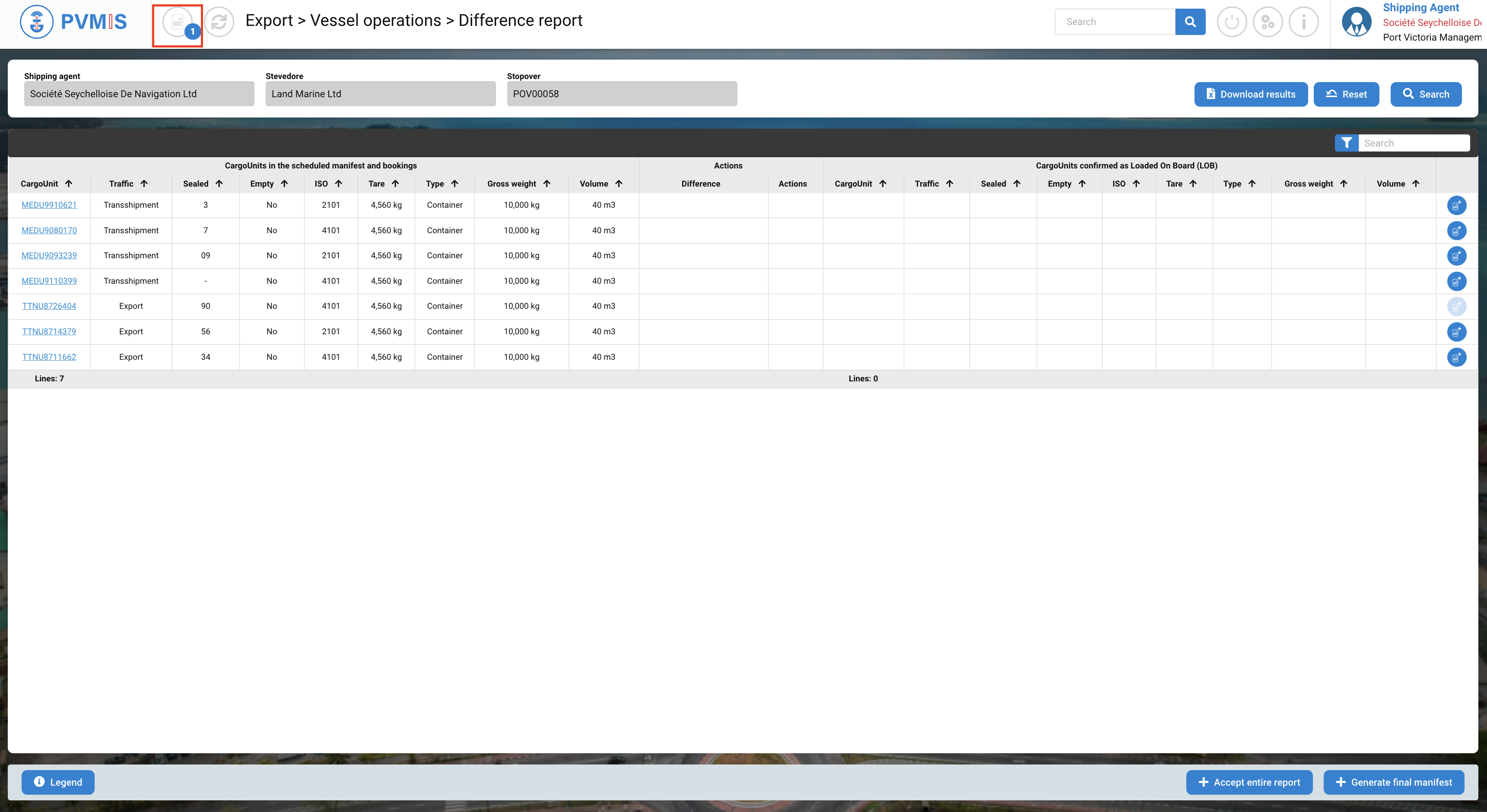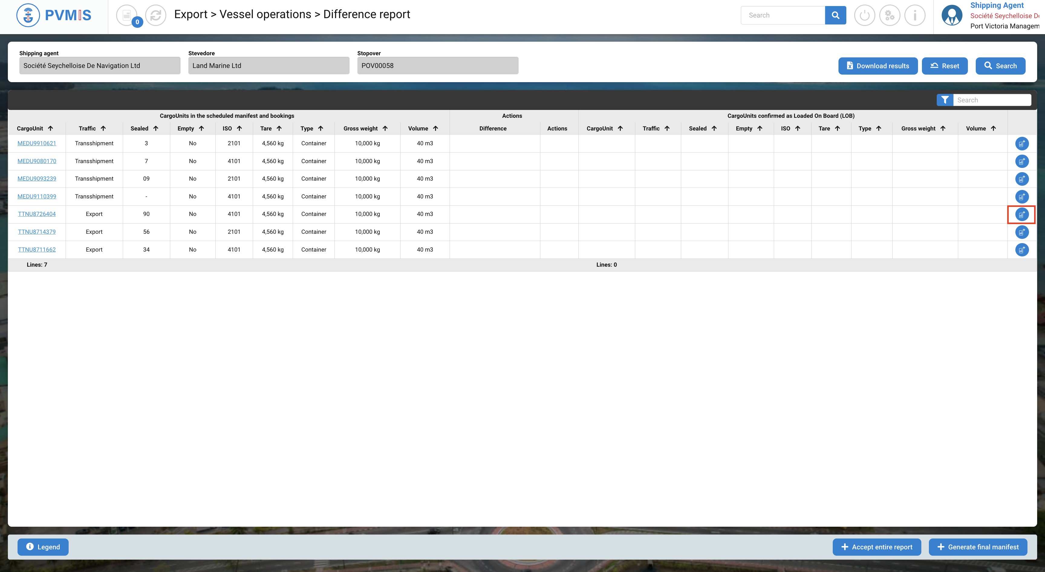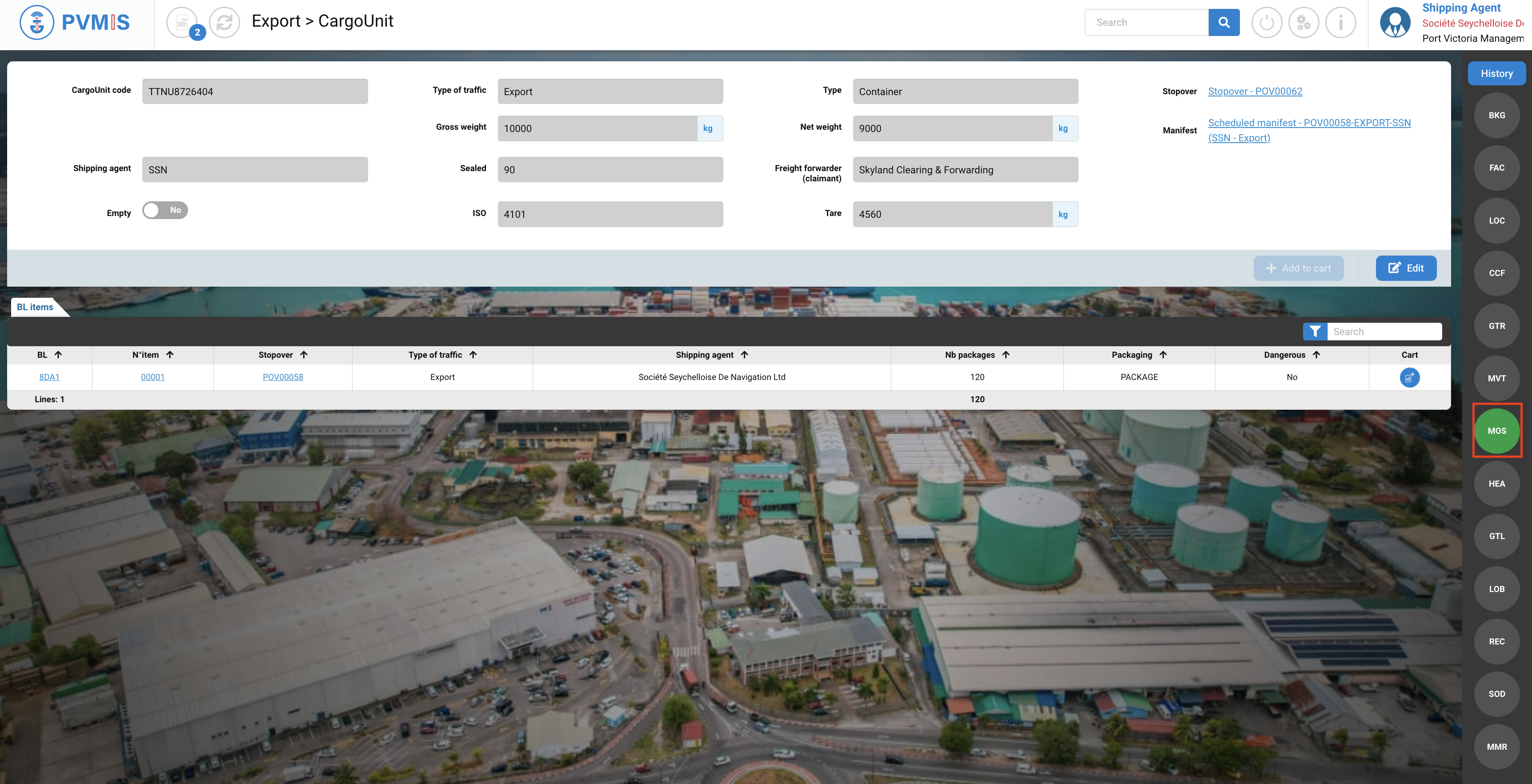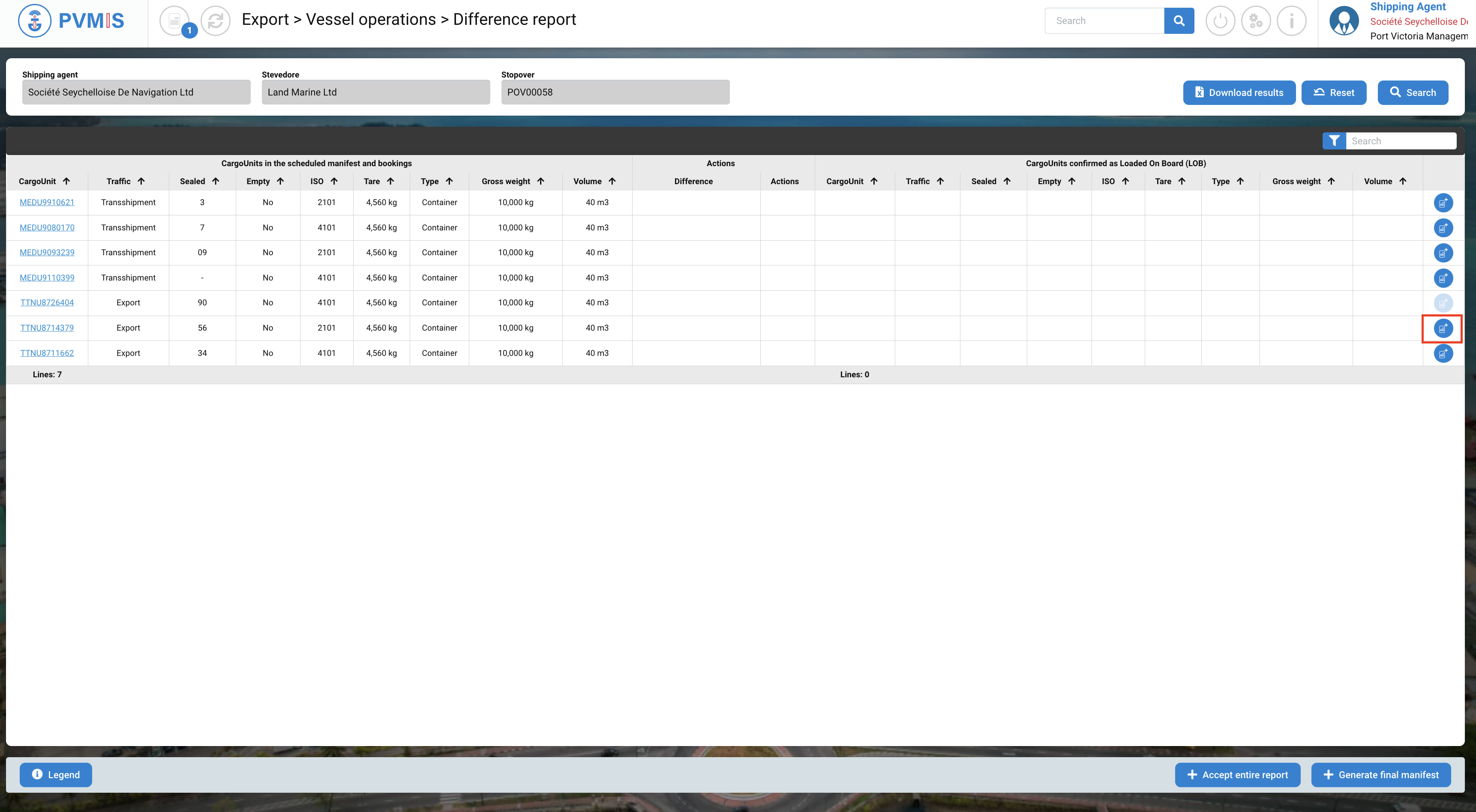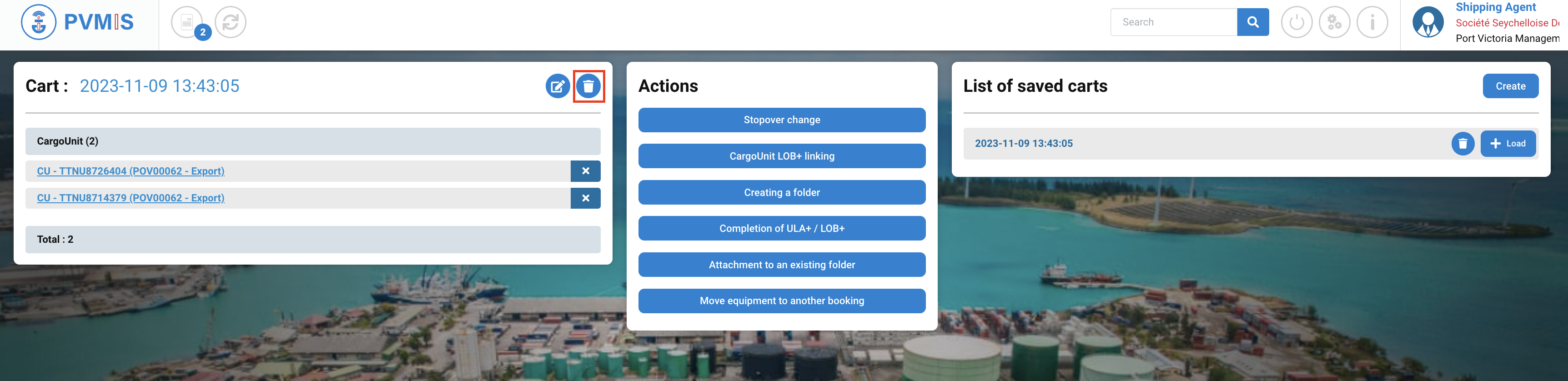 You can consult the list of the CargoUnit announced in the scheduled manifest and bookings. Select the CargoUnits which you would like to load them on another stopover by clicking on Cart icon: