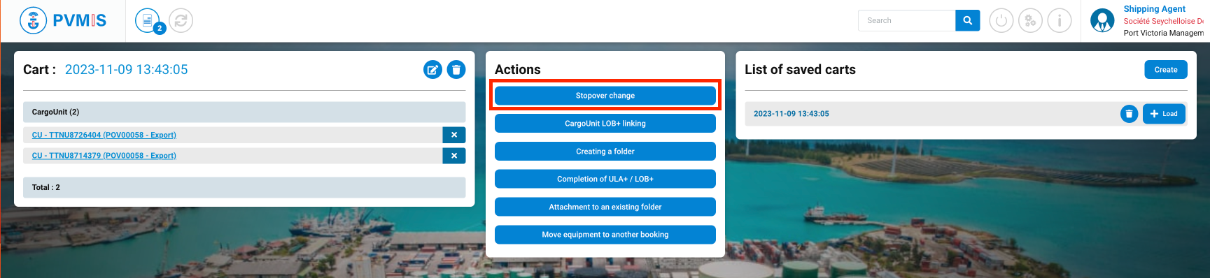 In the Cart, you can see in the left column the presence of the both CargoUnit entities, and on the Actions column click on Stopover change button: