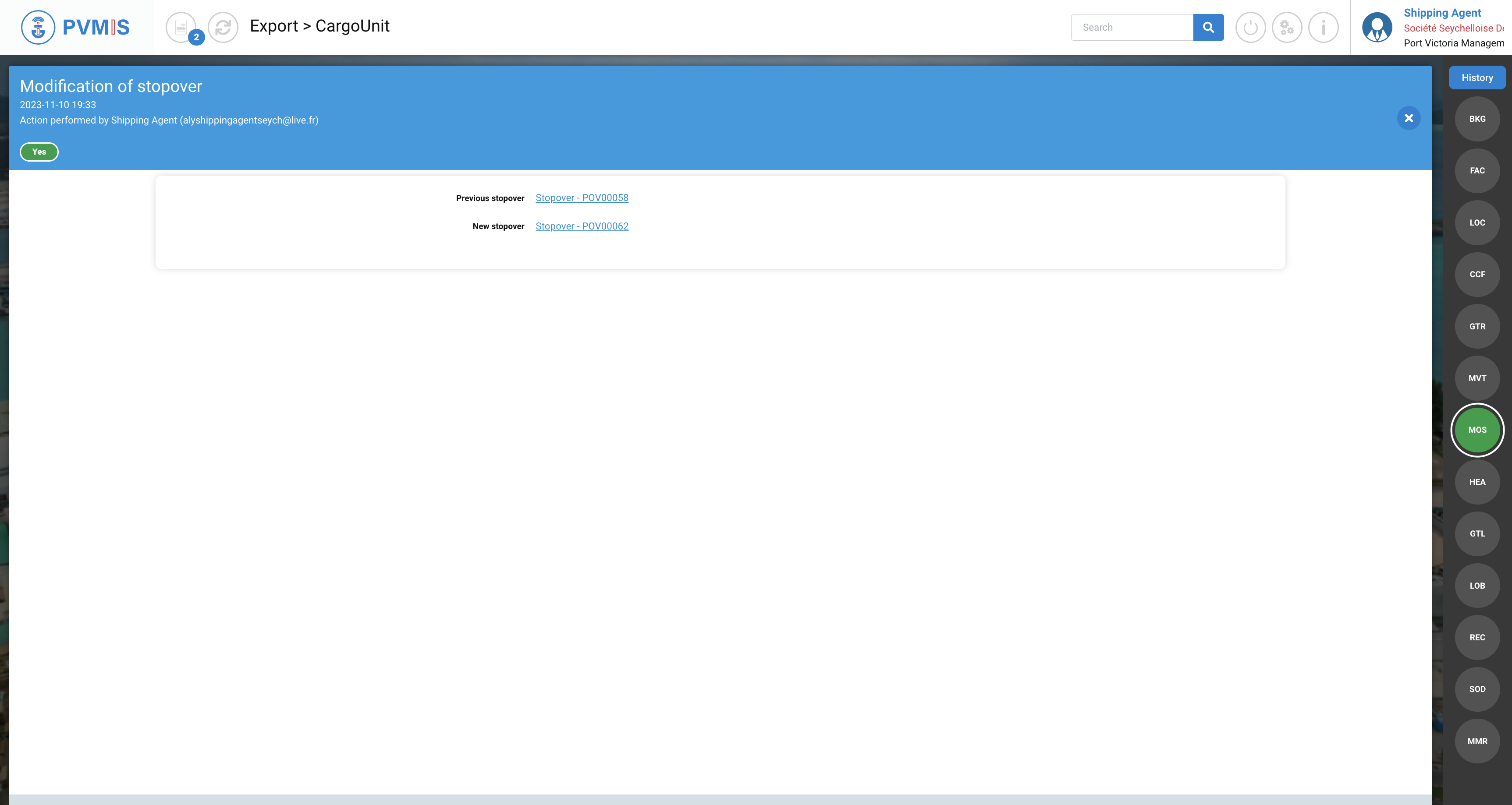On the detail page of the CargoUnit, you can see the MOS status turn green on the right of screen. The MOS (Modification of stopover) status corresponds to the movement of the CU to a stopover different from that which was announced. Click on MOS status: