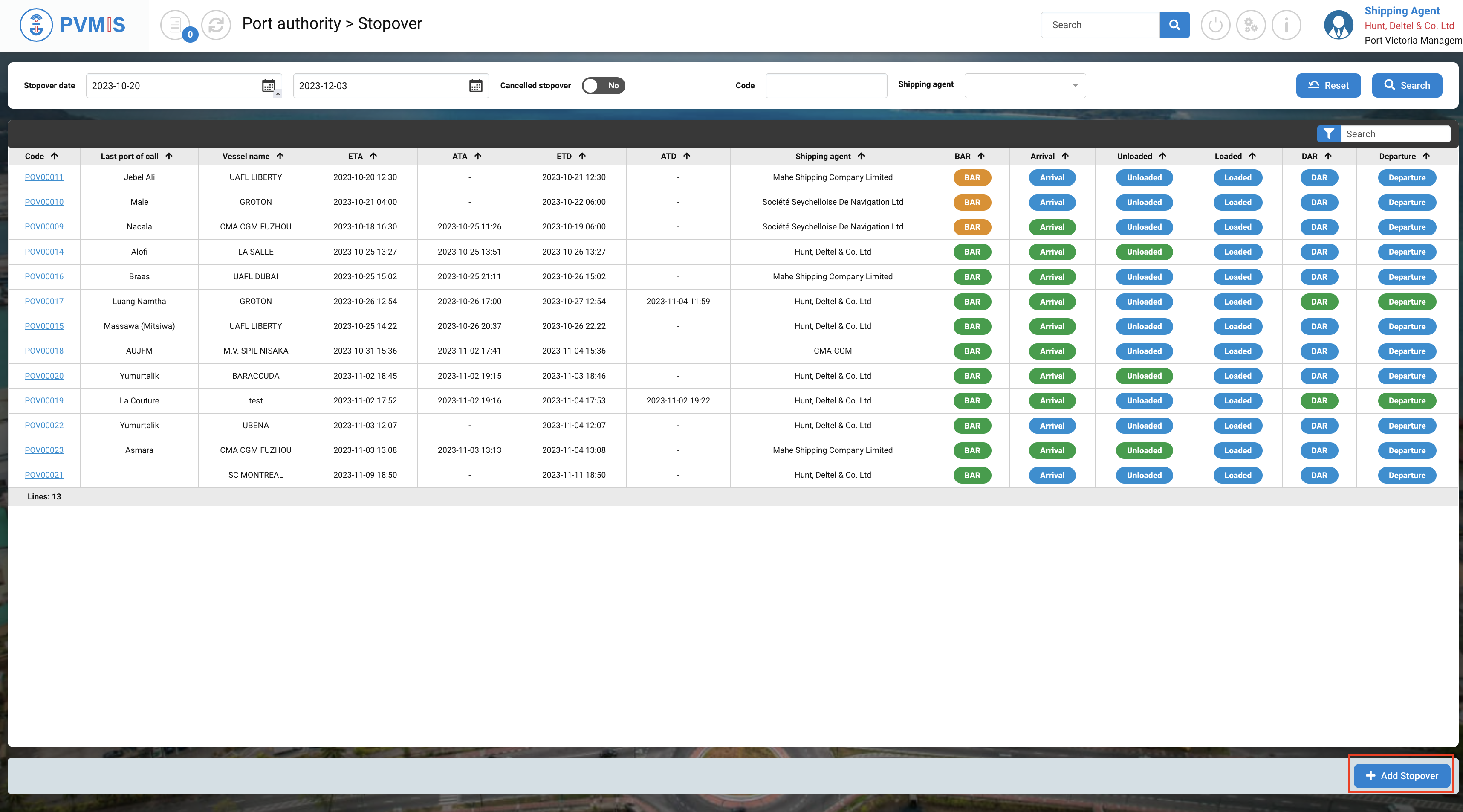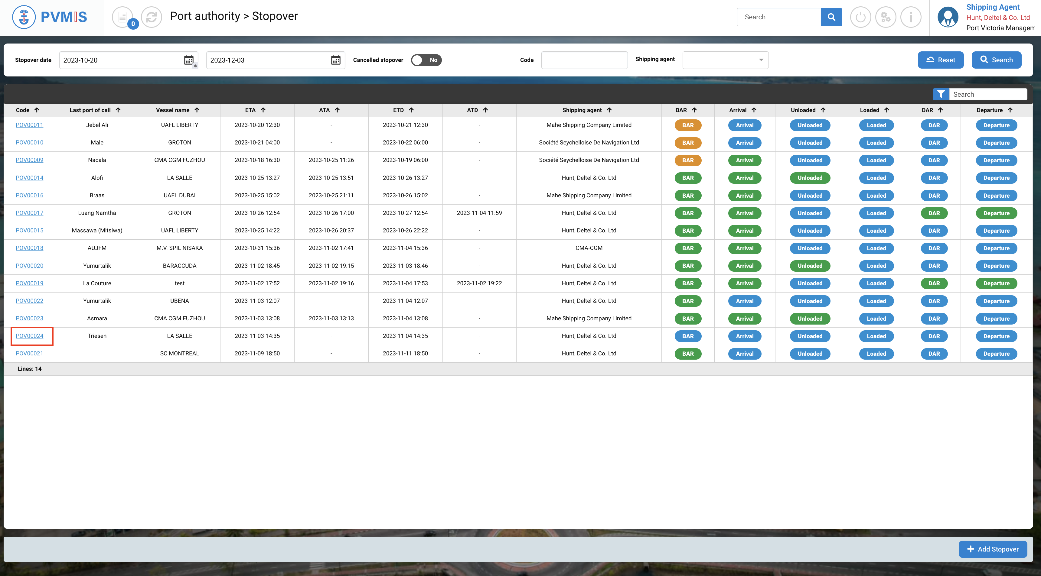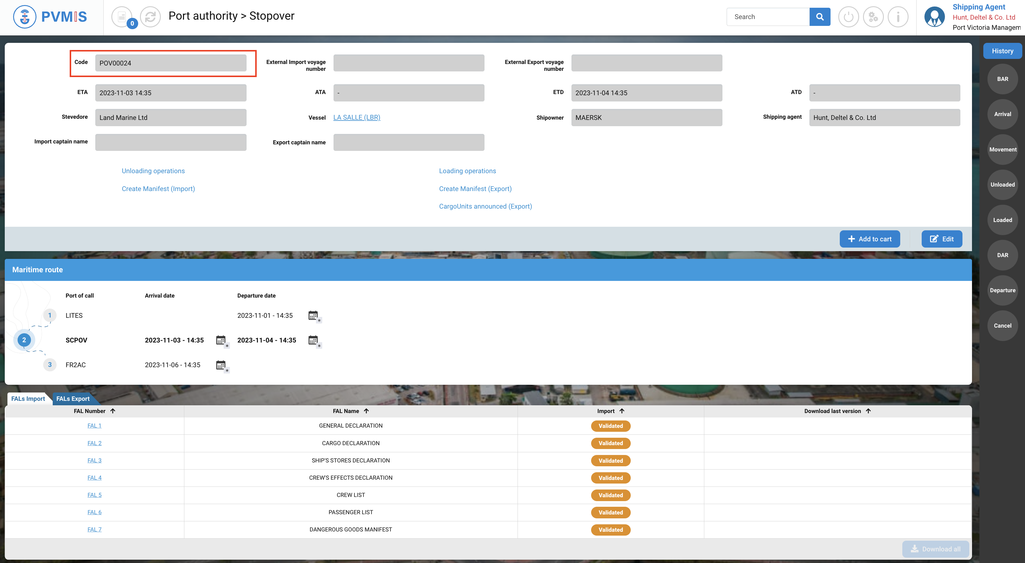 A stopover number is generated. It begins with the port code, i.e. "POV", followed by a series of digits. This will be displayed or indicated for all future processes.