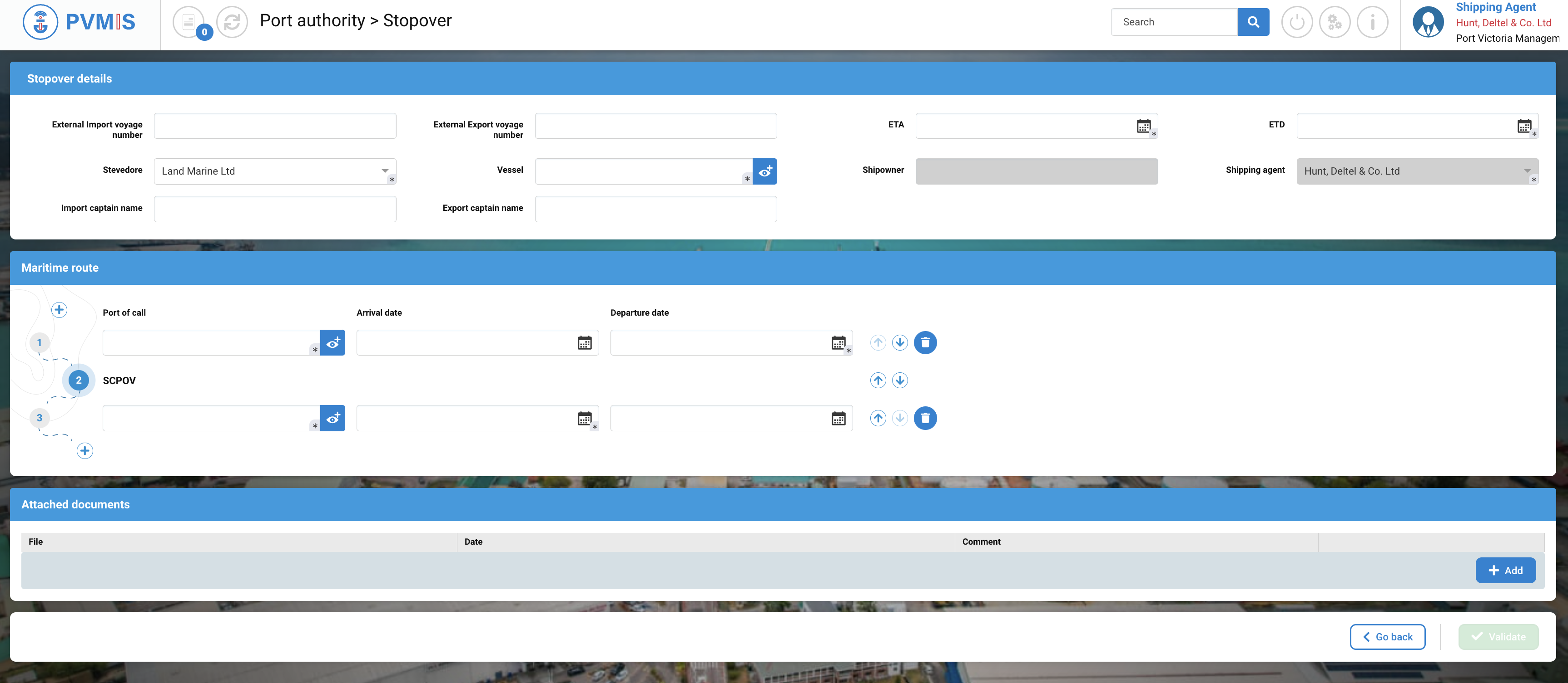 Upon clicking the “+ Add Stopover" button, you will be directed to the Harbor Master’s Office > Stopover page. To confirm the creation of your stopover, you must fill out the form, which is divided into three sections: