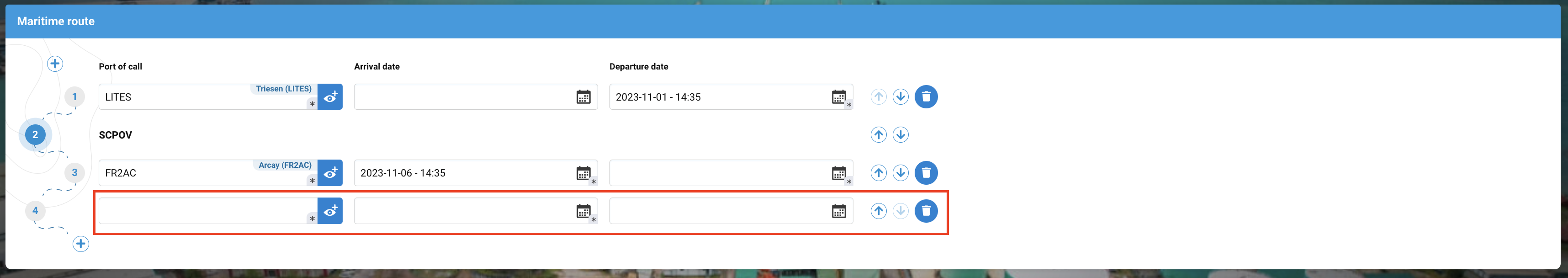Arrival date* | Date of arrival at the next harbor after the SCPOV stopover. |
