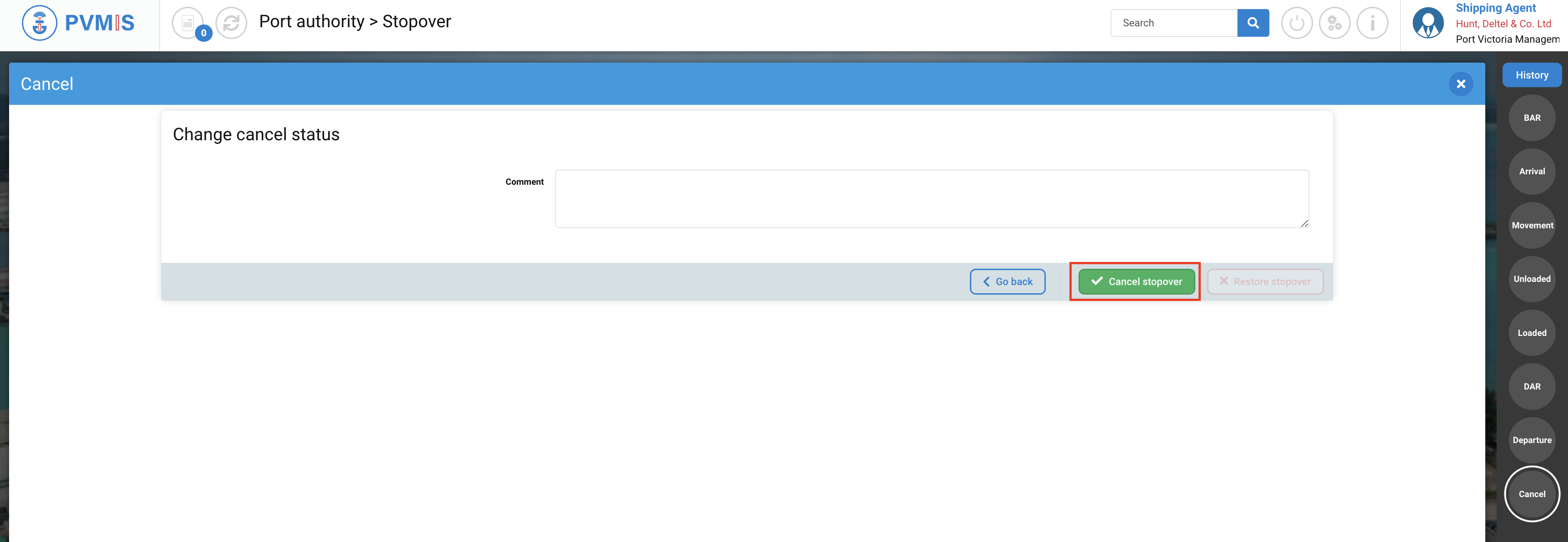You can add an optional comment and click on Cancel the stopover button: